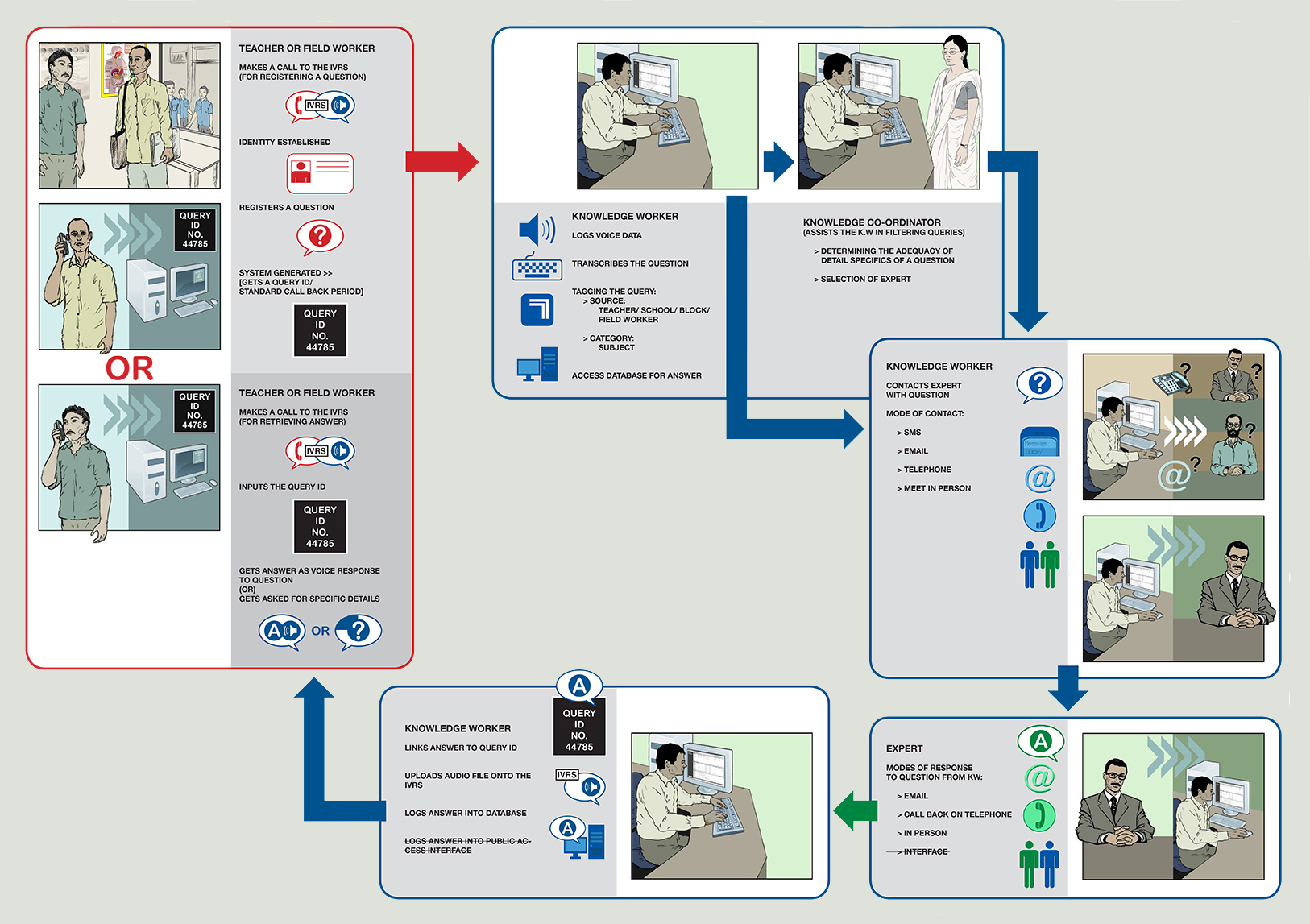 One World South Asia is an international non-profit working towards democratizing technology. The Lifeline for Education program being managed by One World, intends to provide academic support to teachers in rural schools in India using accessible communication mediums like mobile phones. The system uses simple communication protocols, such as the telephone, laid over an IT and internet-based system. Its design is guided by lessons learned from an existing project that addresses the knowledge needs of farmers.